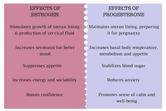 Towards the end of week three, your estrogen levels will drop and your body will start to produce progesterone. Progesterone will raise your body temperature, often correlating with an increased metabolism and appetite. You may begin to feel a bit calmer and introspective.