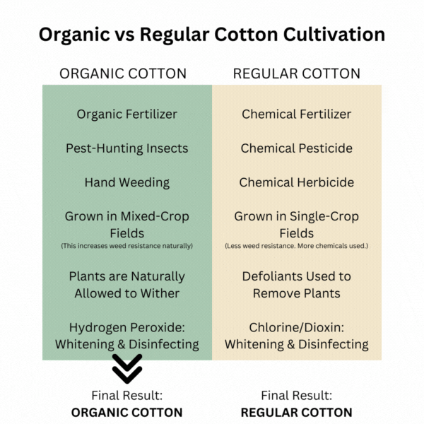 One of the most notable differences between organic and regular cotton is the farming methods. Organic cotton farmers can only be certified organic if chemicals have not been used in over 3 years. Regular cotton farmers use toxic chemicals daily.