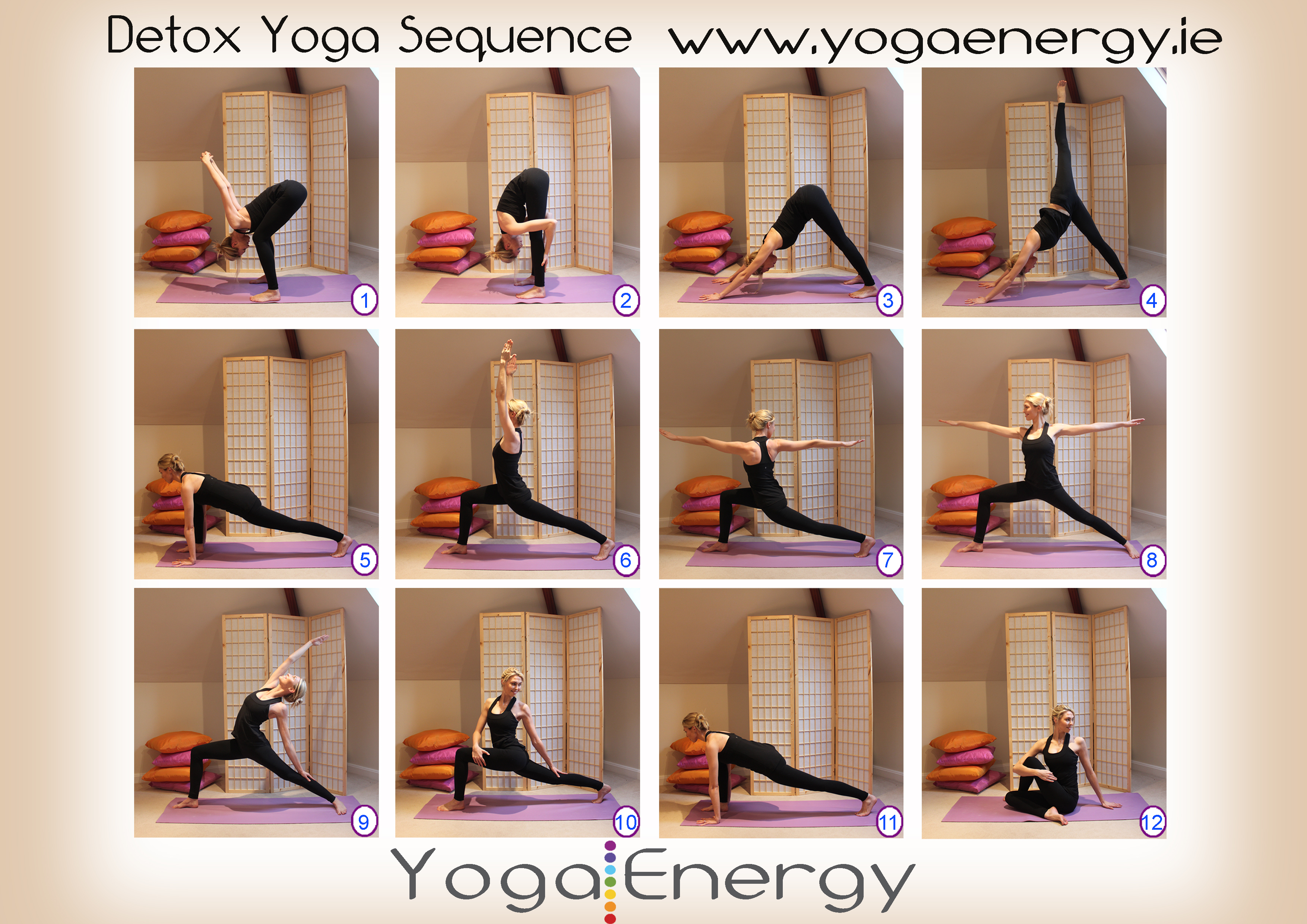 - Try detox yoga poses. See the diagram below for some ideas and for detailed instructions on how to perform the poses, click here.